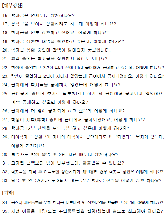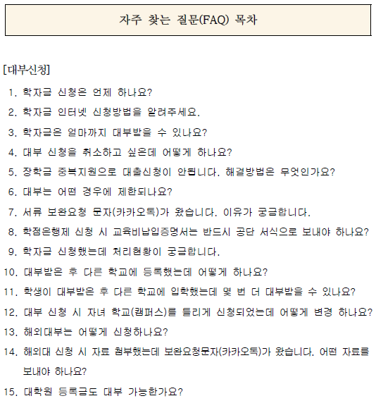 한마디로 '대학교' 등록금만 지원한다는 거죠, 대학원 등록금 대부 외 대출 신청 관련, 대출 상환 관련 FAQ 자료를 아래에 붙였으니 같이 참고 바랍니다.