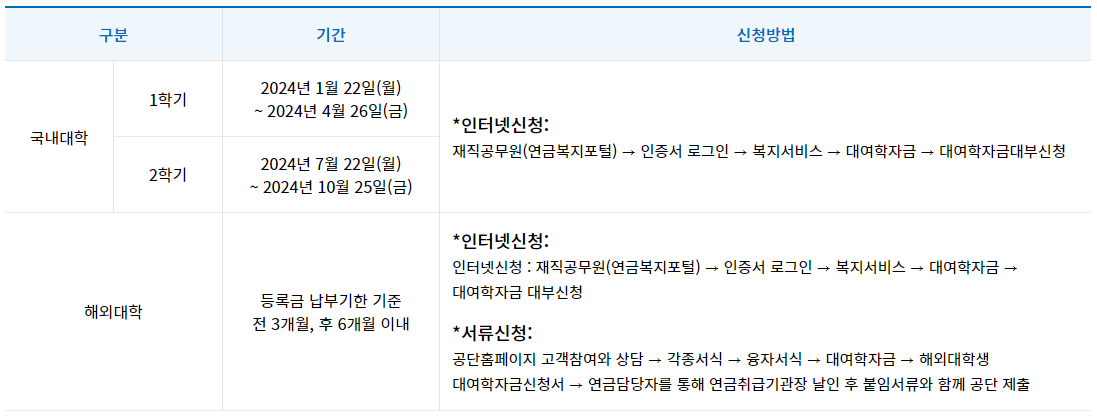 - 국내 다학기제 시행대학의 경우에도 반드시 위 대부기간 내 학기별로 1회 대부신청